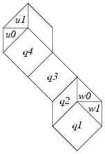 The entire central torus wraps from left to right (so the lower left edges of most quadrilaterals qi are identified with the upper right edges of q(i-1), and the left edge of qk is identified with the right edge of w1). As an exception, the two uppermost edges are identified with the two lowermost edges in a parallel fashion (so the upper left edge of u1 is identified with the lower right edge of q1, and the adjacent edges at right angles to these are also identified).