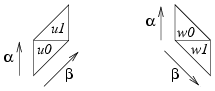 The four triangles in the central torus correspond to the four tetrahedra in the triangulation that provide the boundary triangles. The upper boundary is coned out from triangles u0 and u1, and the lower boundary is coned out from triangles w0 and w1. In each boundary, u0 or w0 gives the first boundary triangle and u1 or w1 gives the second. The directions of the corresponding alpha and beta curves are illustrated below.