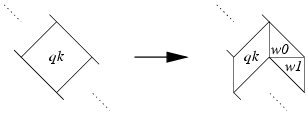 We then distort quadrilateral qk and attach two more triangles w0 and w1 to its side (these will eventually provide the lower torus boundary). This is illustrated in the following diagram.