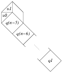The central torus begins with two triangles u0 and u1 (which eventually provide the upper torus boundary), with a chain of quadrilaterals q1, ..., q(n-5) descending diagonally beneath them as illustrated in the diagram below.